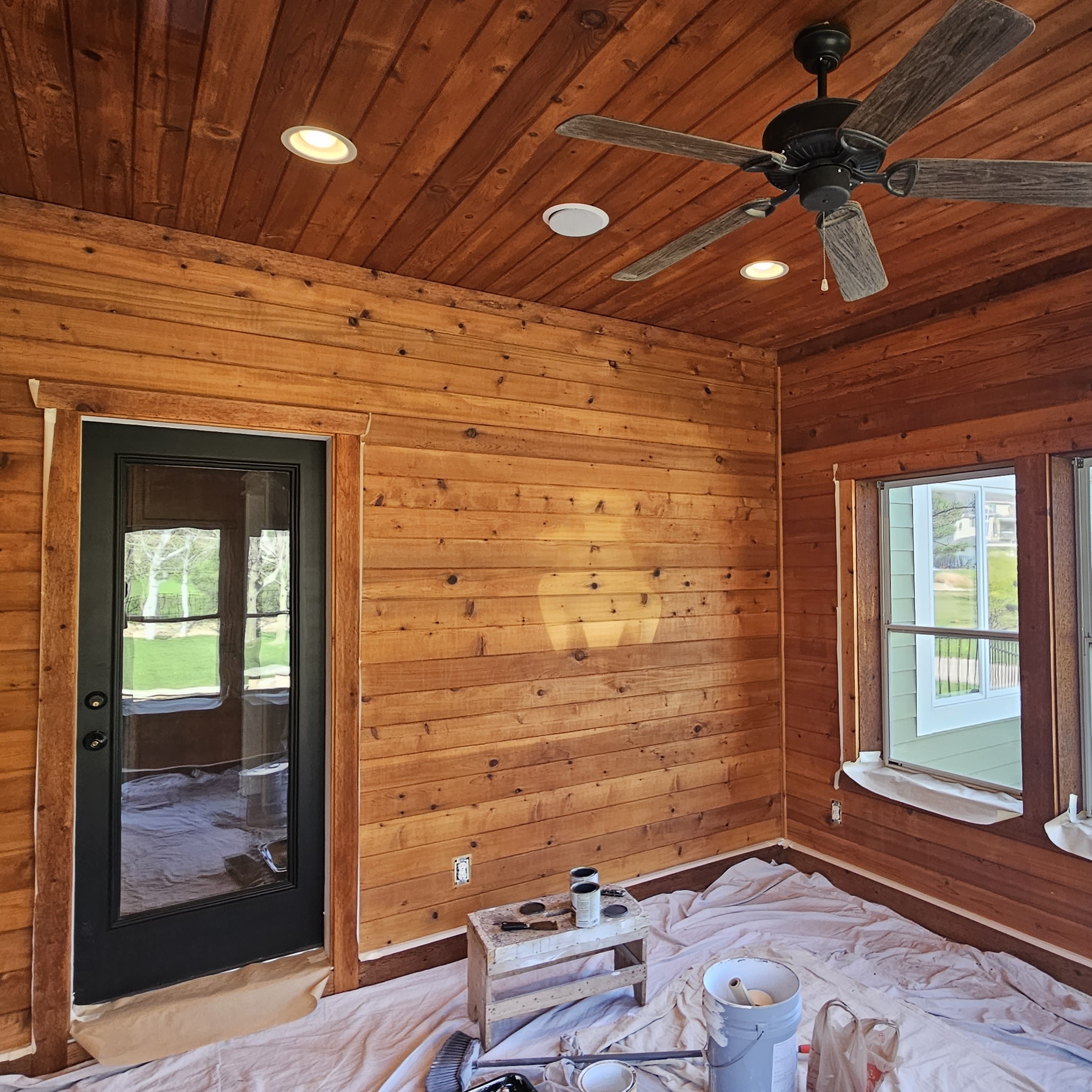A complete transformation from top to bottom. We clear-coated the cedar ceiling with polyurethane to showcase its natural warmth, primed and painted the walls with durable oil finishes to brighten the room, and pressure washed and stained the floor for a crisp, finished look. Now this porch feels fresh, welcoming, and ready to enjoy year-round.